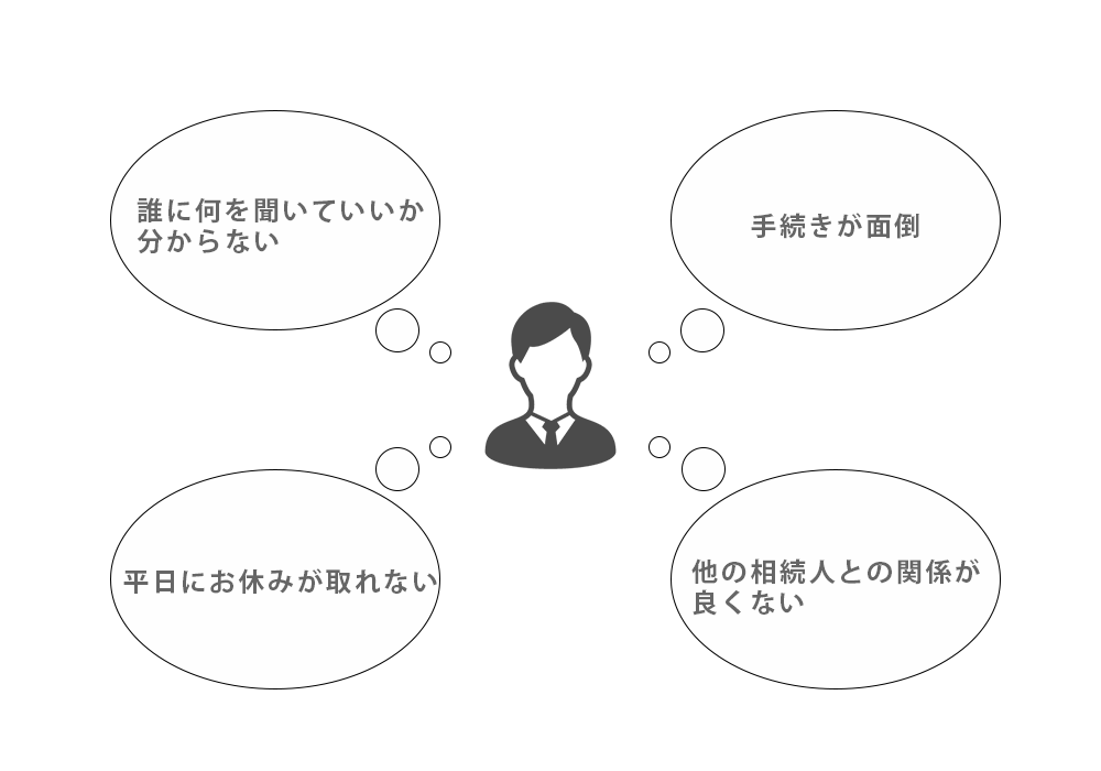 相続の手続では業務によって対応出来る専門家が決まっている為、手続のたびに別の専門家の所に行き事情説明をしなければならないという事態も発生します。そこで弊社ではまず弊社が事情をお伺いして各専門家と情報を共有して業務を進めますのでお客様の負担を最大限軽減することが出来ます。